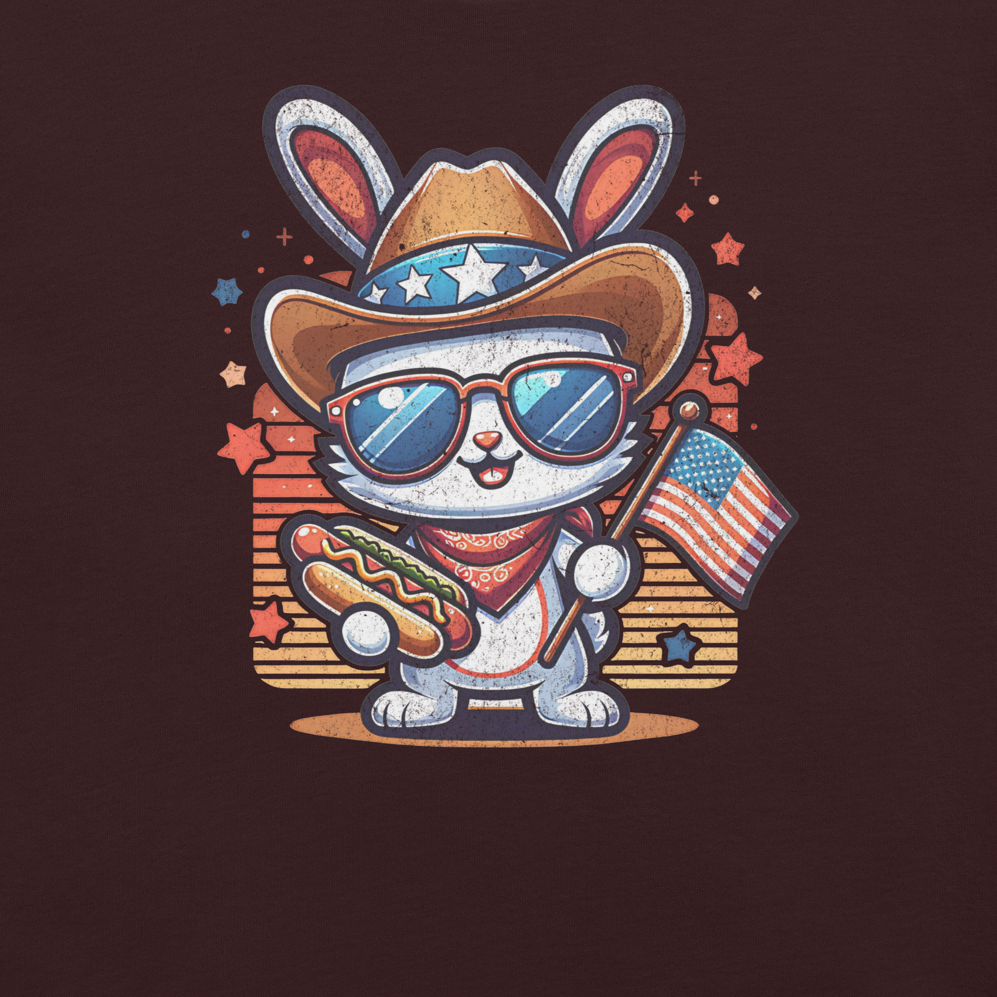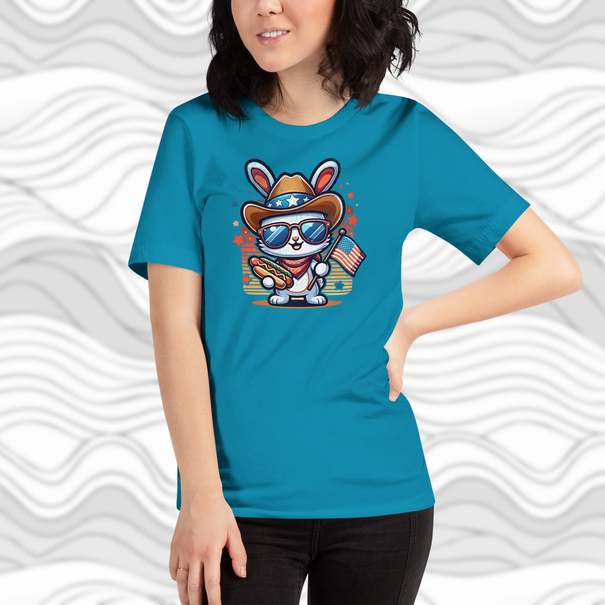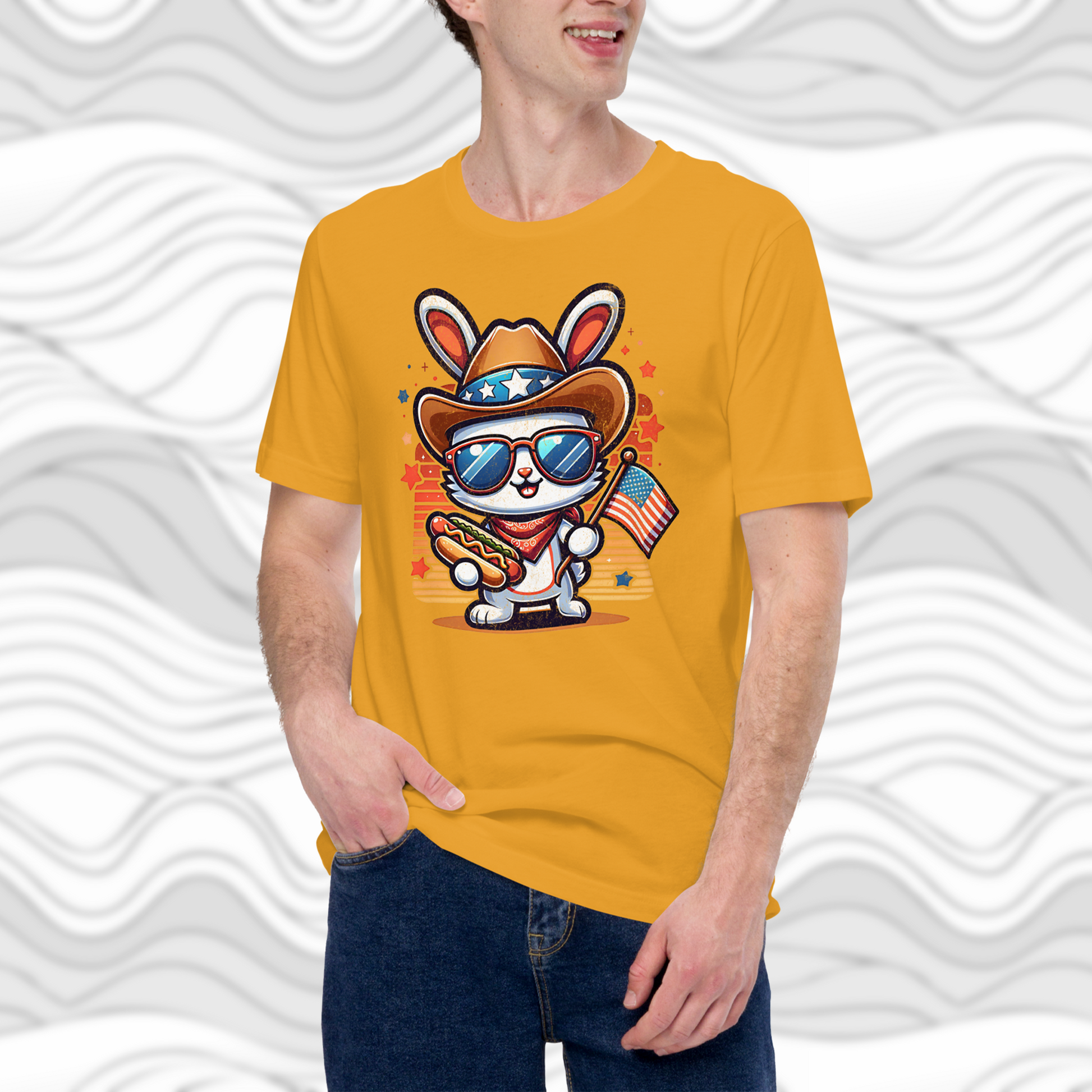 Celebrate freedom with a wink and a hot dog! This 4th of July unisex t-shirt features a rabbit rocking a star-spangled cowboy hat, red bandana, and all-American spirit. With Old Glory in one hand and backyard BBQ vibes in the other, this tee brings humor and patriotism together in one vibrant design. Whether you're watching fireworks, grilling out, or just showing your stars and stripes, this soft and comfy shirt is your festive go-to.