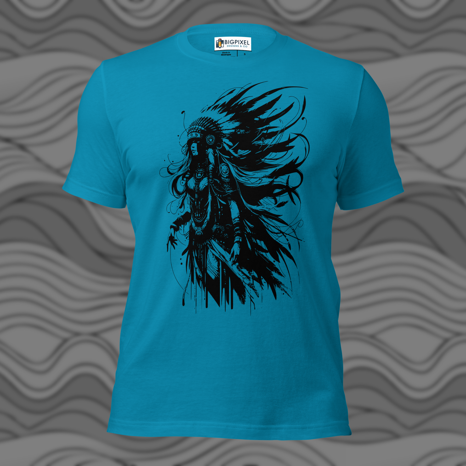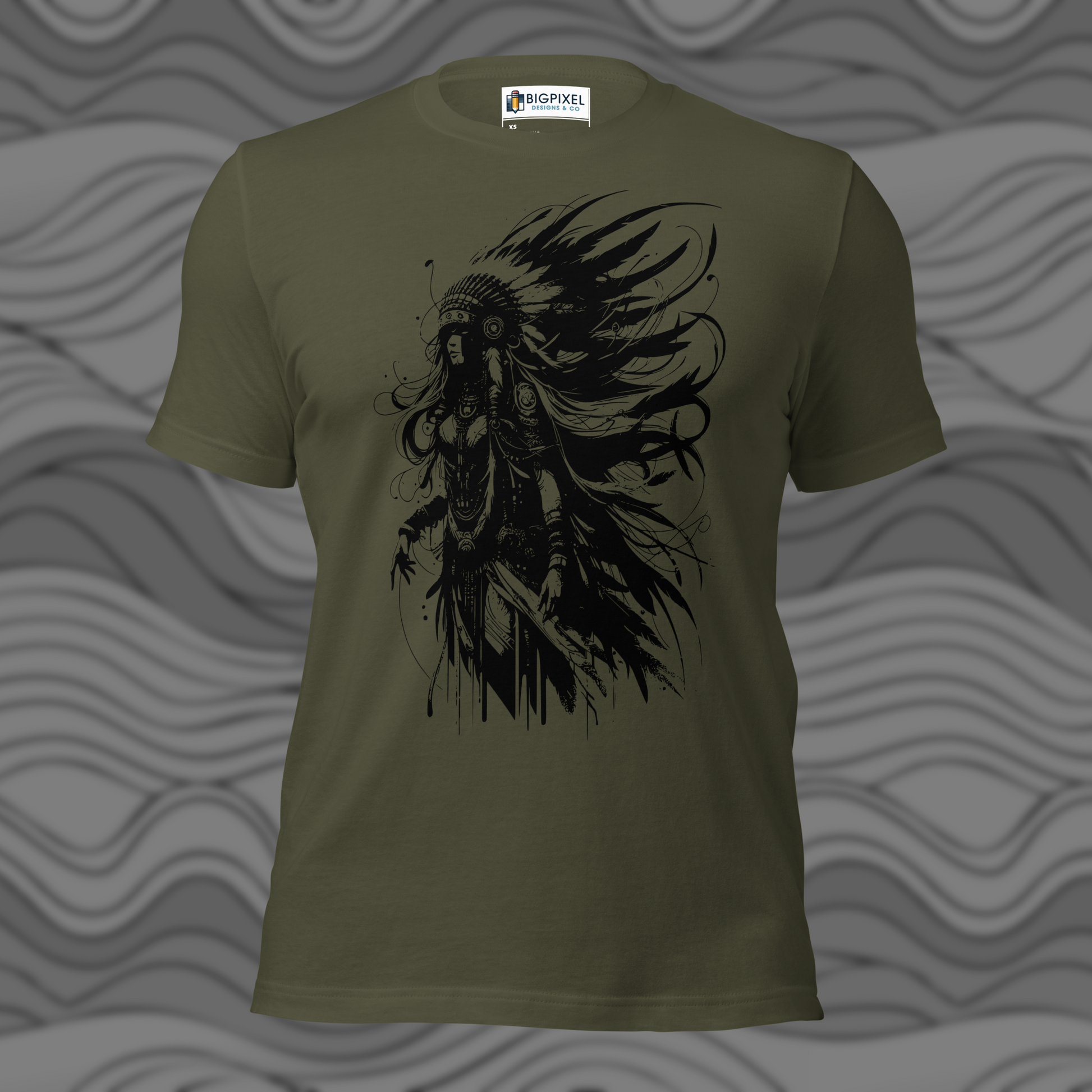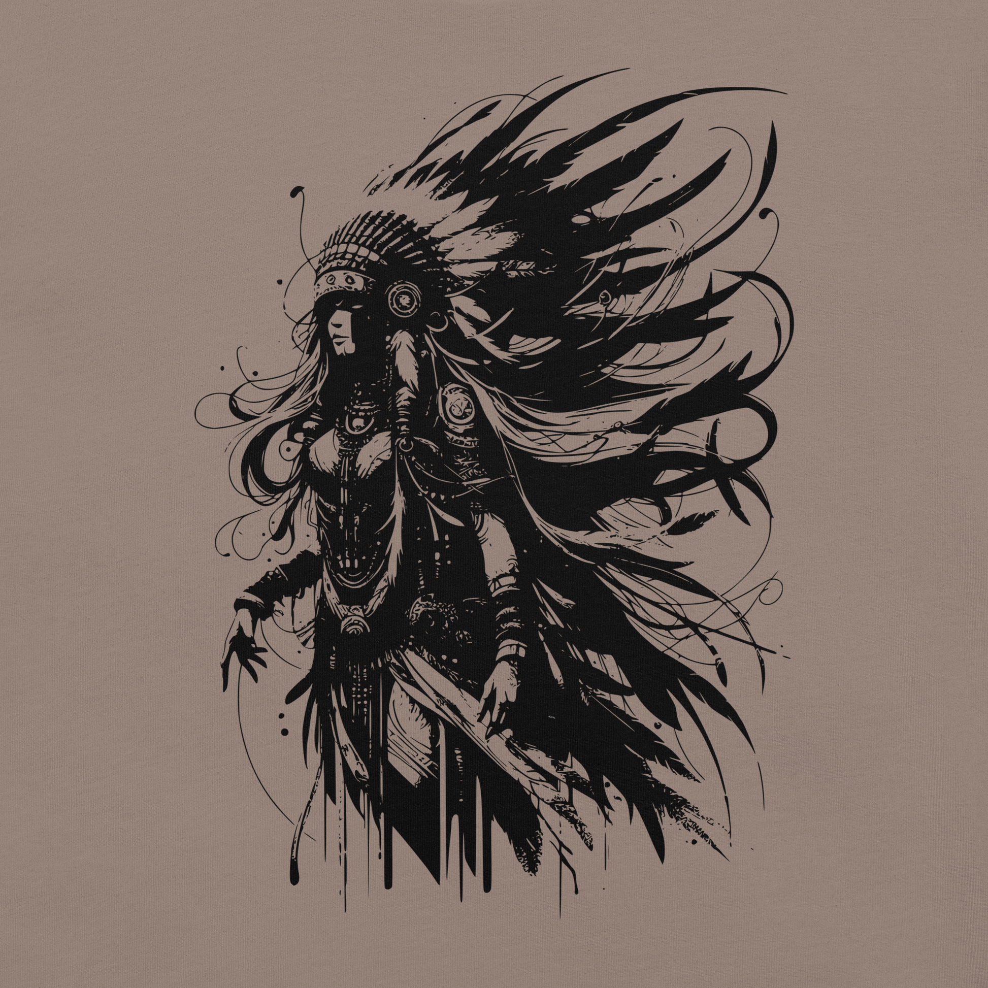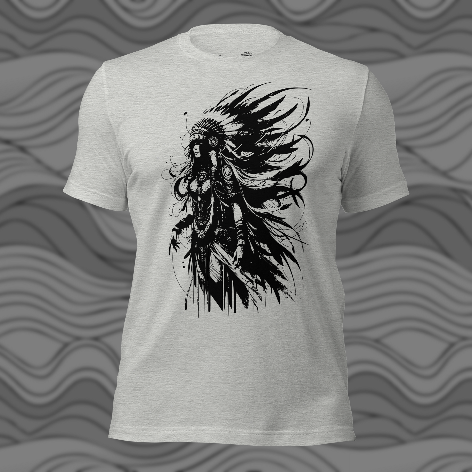 Strength and artistry unite in the Female Warrior t-shirt, featuring a powerful black and white illustration of a fearless figure adorned with flowing feathers and intricate details. This striking design captures courage, focus, and resilience, reflecting the timeless spirit of the modern warrior.