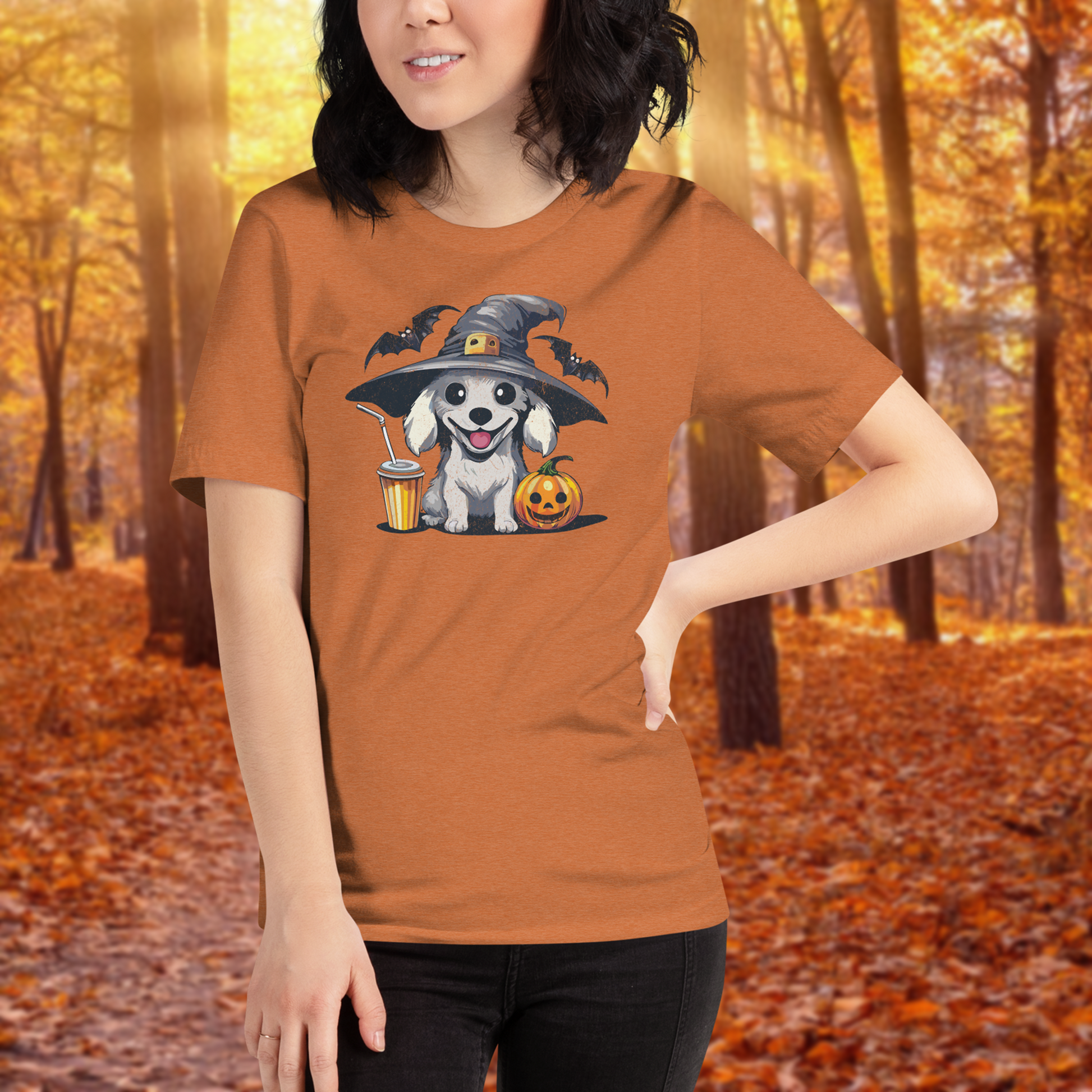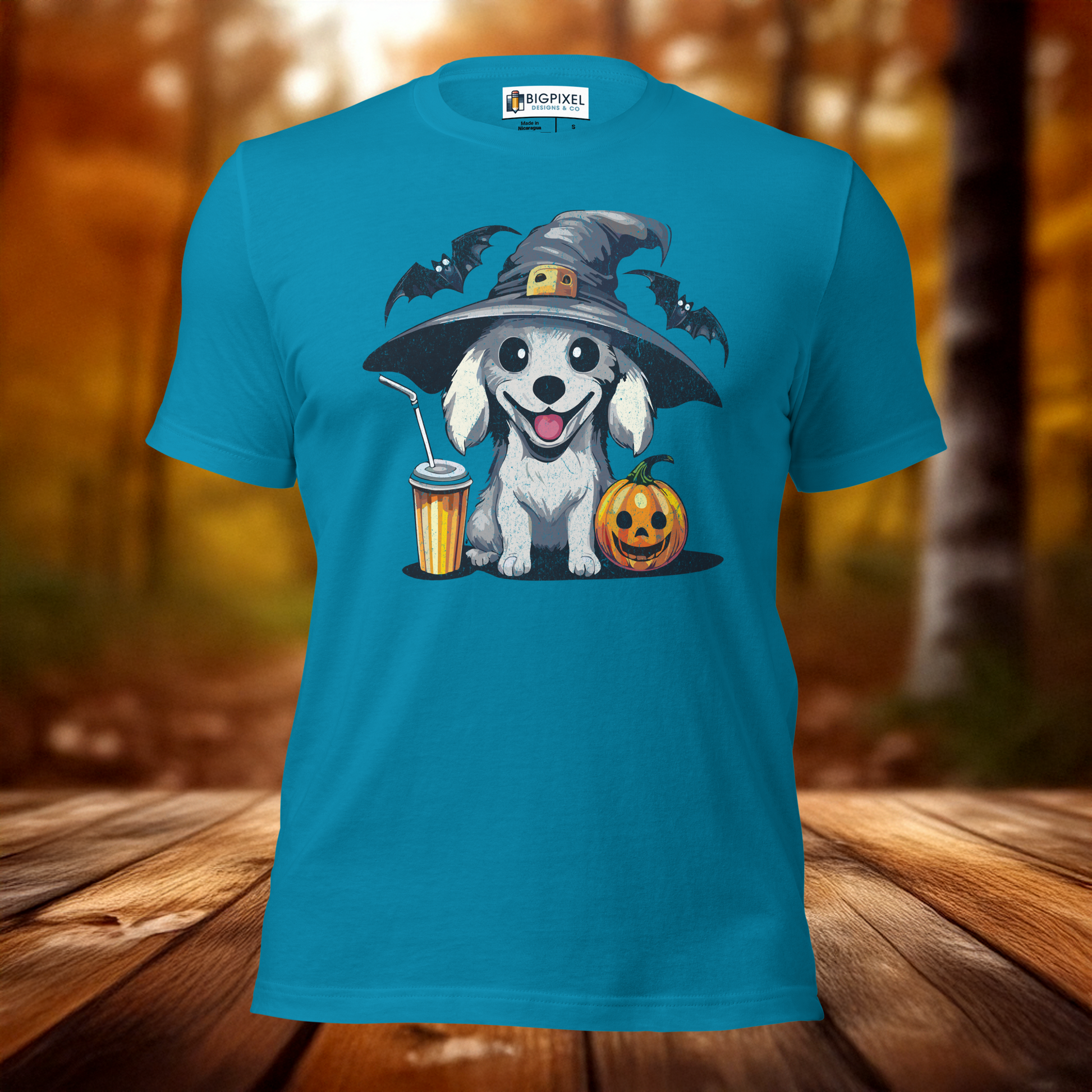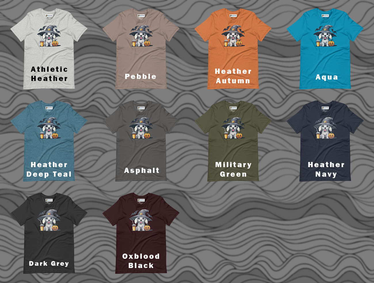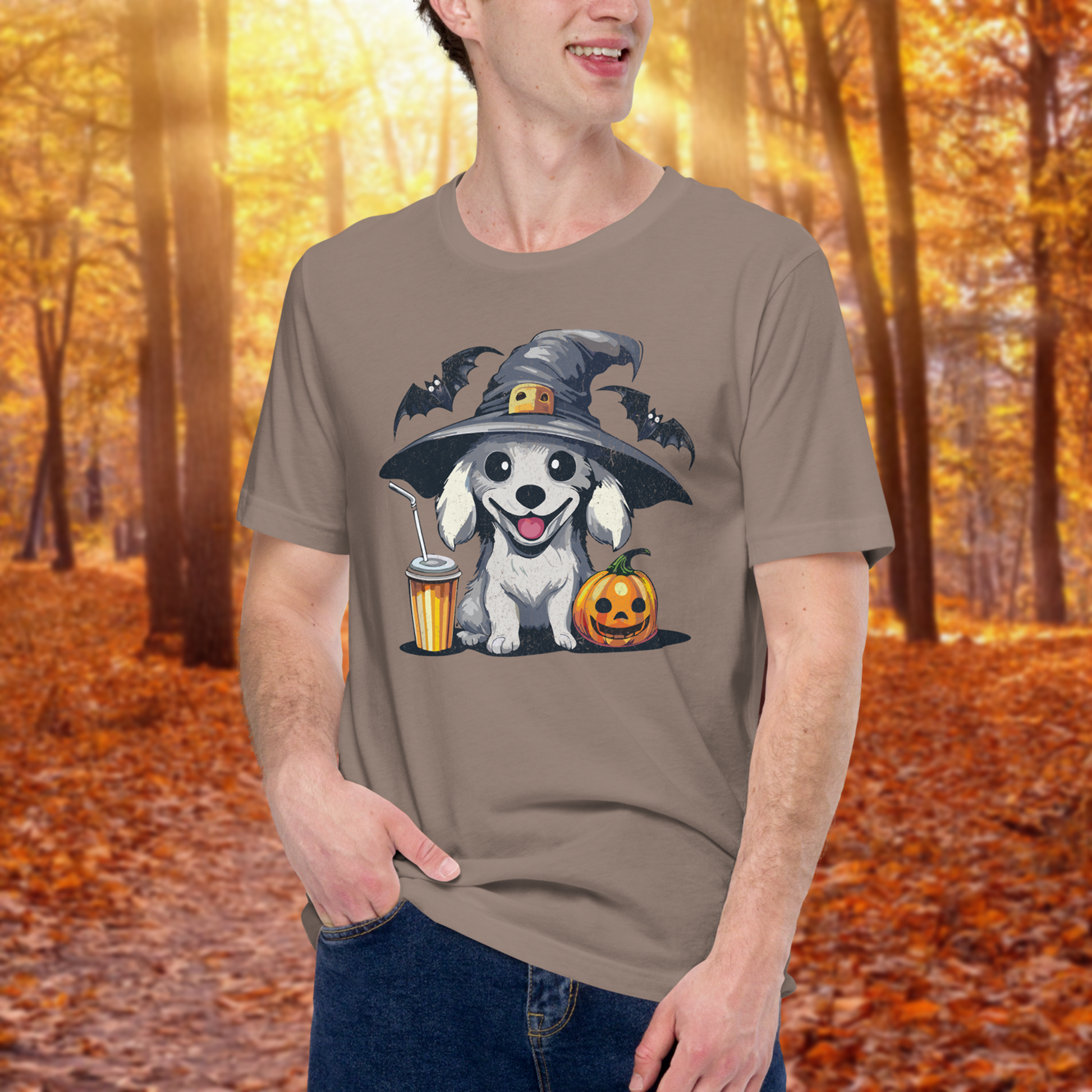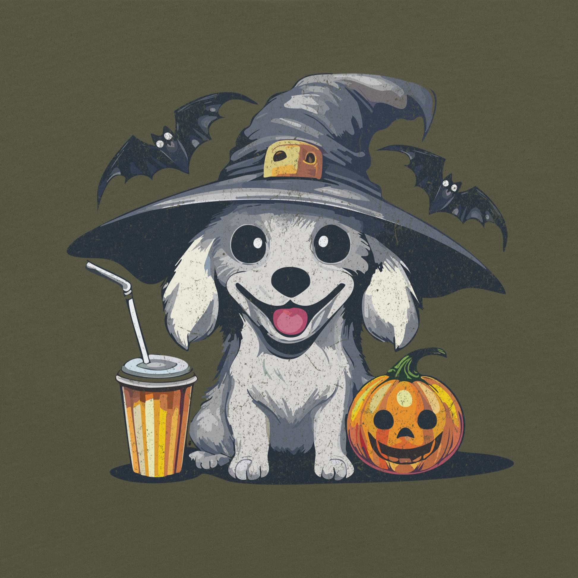 The artwork balances festive Halloween icons - like fluttering bats and a seasonal drink - with the charm of a loyal furry friend. Perfect for dog lovers and Halloween enthusiasts alike, it’s a design that blends cozy autumn vibes with lighthearted fun. Whether you’re headed to a fall festival, walking through a pumpkin patch, or just want a cheerful seasonal tee, this design delivers.