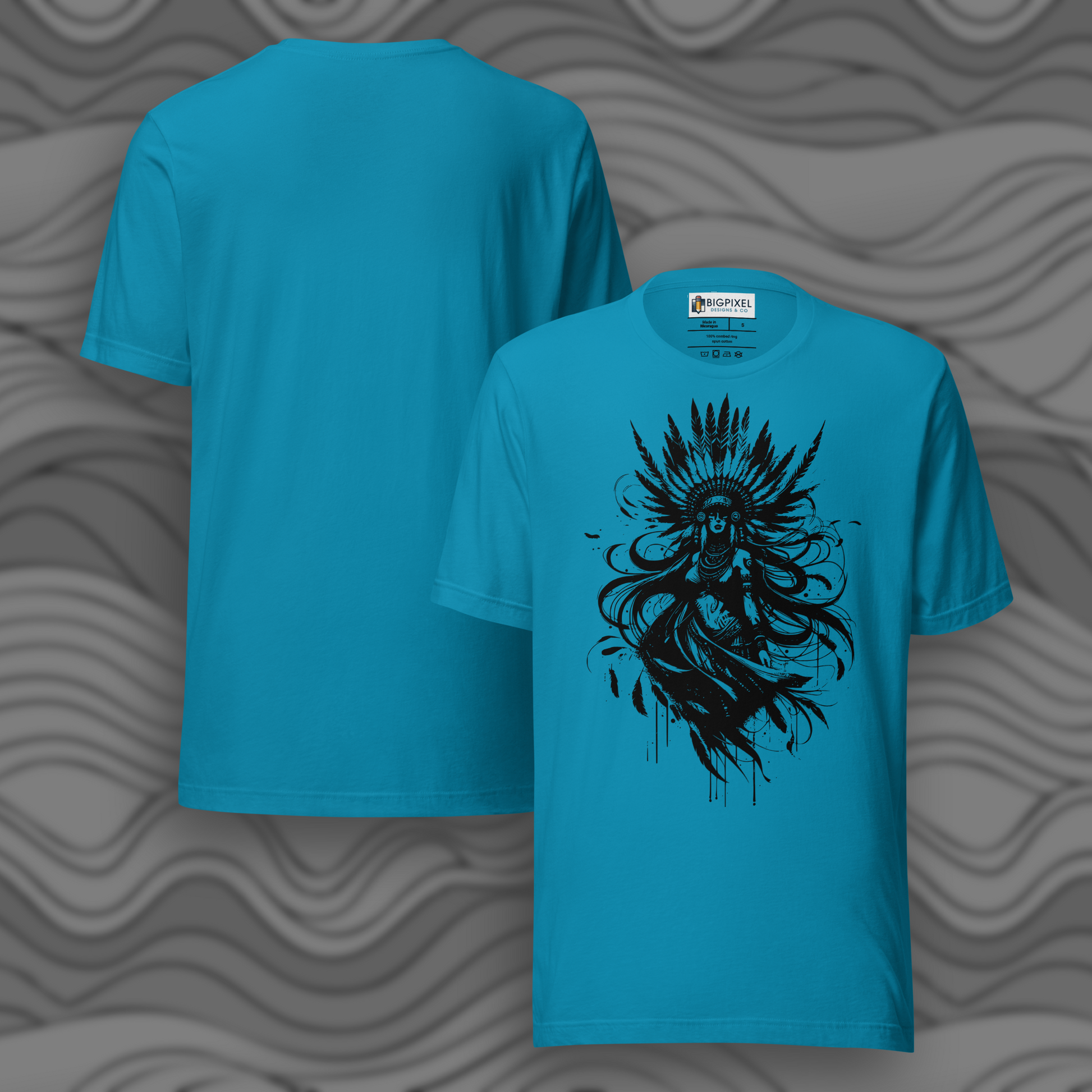 Mystery and movement intertwine in the Whispers in Ink T-shirt featuring a captivating black and white illustration of a powerful yet graceful figure adorned with flowing feathers and intricate details. The design embodies strength, balance, and quiet confidence, making it a bold and timeless statement piece.